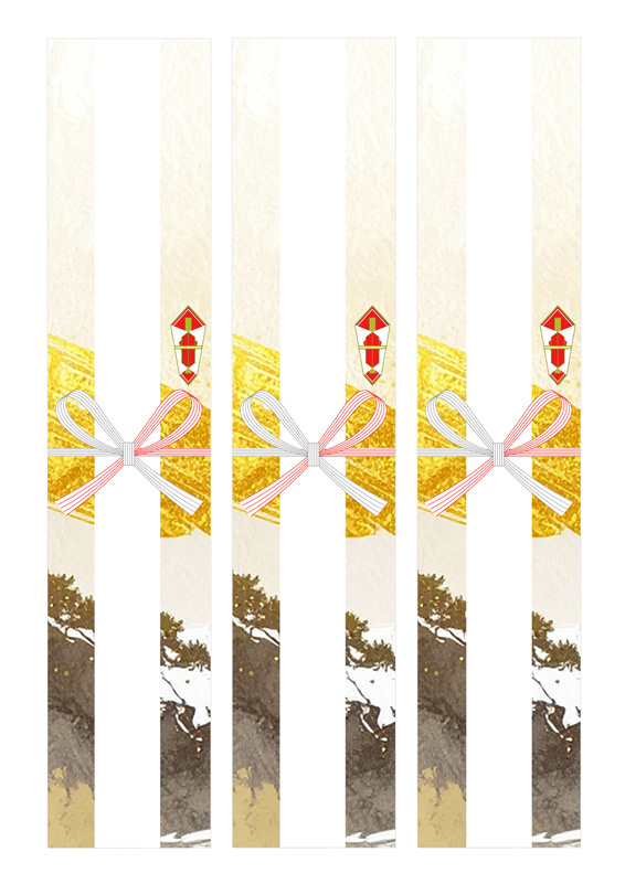 和紙の背景に金箔の刷毛模様をドーンと配置した、豪華でインパクトのあるデザイン!お歳暮など年末の贈り物にぴったりですね。背景には日本の風景も描き、和のイメージを強く出してみました。短冊熨斗紙なので、ペタッと貼ったり巻いたり。カジュアルはプチギフトにも最適なテンプレートです。