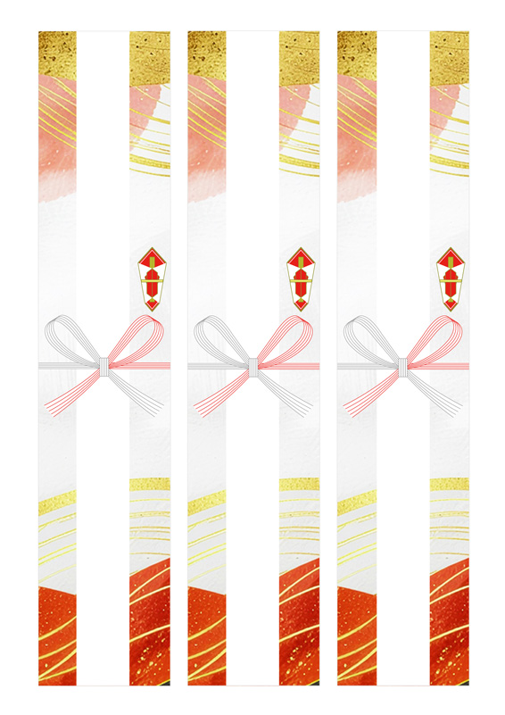 赤と金の縞模様を重ねた、豪華で品のあるデザイン。ちょっとしたお歳暮やプチギフトにぴったりの短冊熨斗紙ですね!中央には白背景を入れて、表書きや名前を入れやすいようにしています。豪華に見せたい場合や、キラッとさせたい場合にどうぞ!
