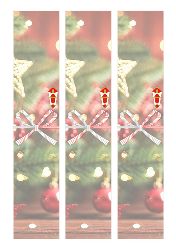 赤と金のオーナメントがきらっと輝く、クリスマスらしい雰囲気の短冊熨斗紙テンプレートです。ツリーの飾りを主役にして、あたたかいトーンでまとめました。王道のデザインなので、クリスマスプレゼントやプチギフトを包むときにもぴったりです!