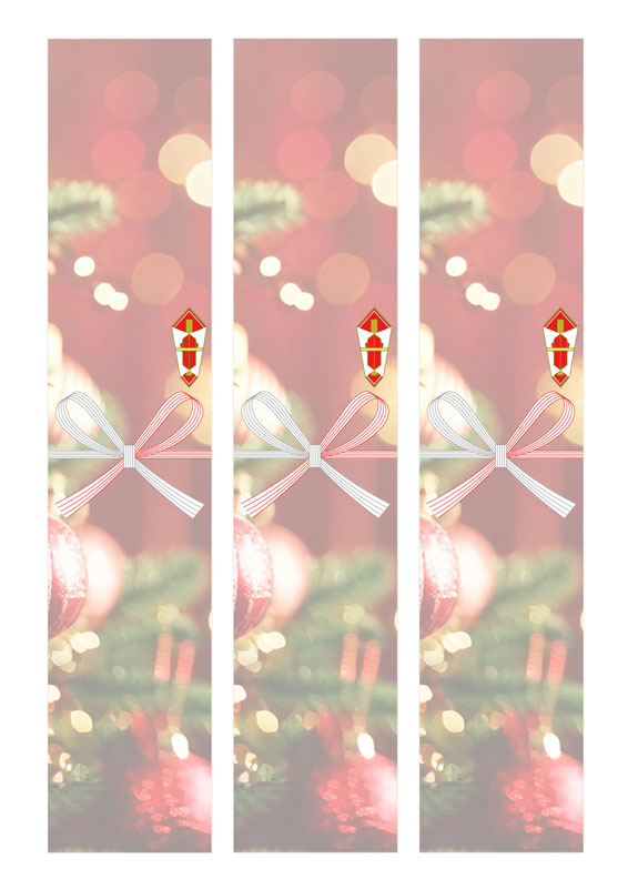 赤いオーナメントがきらっと輝く、クリスマスらしい雰囲気の短冊熨斗紙テンプレートです。ツリーの飾りと赤い光の背景をやわらかくまとめて、明るく元気な印象に仕上げました。お子さんへのプレゼントやプチギフトを包むときにぴったりの一枚です!