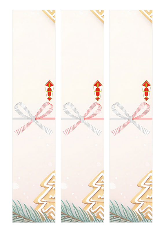 やさしいクリーム色の背景にクッキーツリーとモミの枝を描いた、ほんわか雰囲気のクリスマスの短冊熨斗紙テンプレートです。落ち着いた色合いはそのままに、ラッピングに使いやすいカジュアルさを意識してまとめてみました。プチクリスマスプレゼントや、サクッと渡すギフトを包む場合になどにもどうぞ!