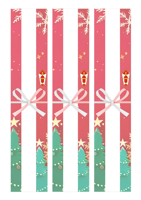 赤い背景にクリスマスツリーと星を合わせた、明るい雰囲気のクリスマスの短冊熨斗紙テンプレートです。まさにクリスマス!なデザインで、ラッピングに使うときもアレコレ考えずに、サッと使えるように仕上げました。家族や友だちへのクリスマスプレゼントにも取り入れやすい、シンプルめのバランスにしています。