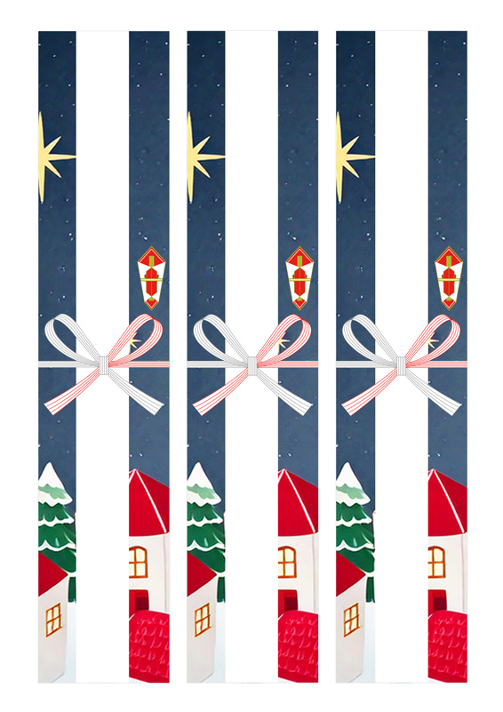 あたたかい明かりの赤い屋根の家、夜空にはキラキラ星。雪景色の家並みを描いた、冬らしいクリスマスカラーの短冊熨斗紙です。優しいタッチのイラストでほっこりと、でもワクワク感も残るように仕上げました。カジュアルなプレゼントや小物を包む場合に便利な1枚です。