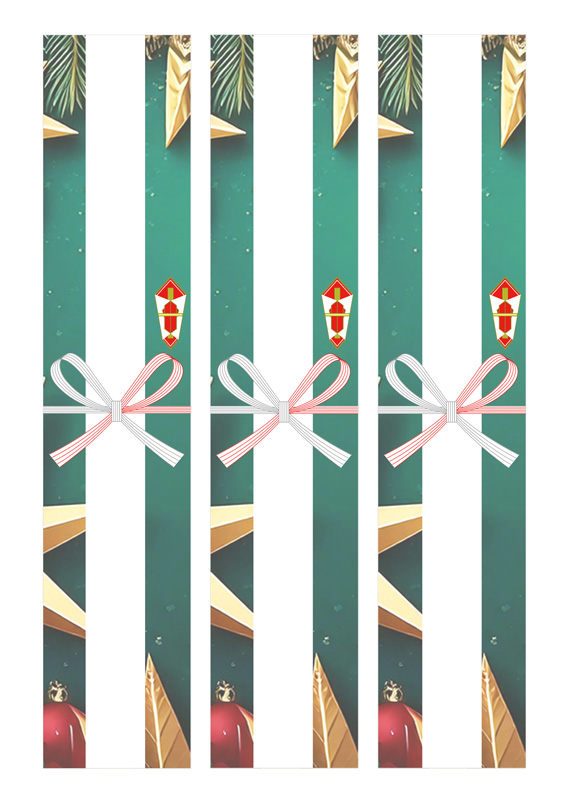 深いダークグリーン背景に金の星がきらっと映える、落ち着いた雰囲気のクリスマス向け短冊熨斗紙です。モミ枝や赤と金のギフトも並んで、大人っぽいクリスマスの空気がそのまま伝わってきますね!小物を包む場合や、カジュアルにサクッと贈りたい場合にぴったり。