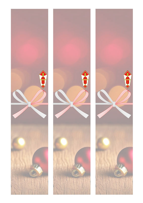 クリスマスプレゼントやプチギフトを包む場合にぴったり!赤いオーナメントが映える木目デザインで、あたたかみのある雰囲気にまとめました。デザインされた短冊熨斗紙なので気軽に使え、家庭でも事業でも使いやすい一枚です。