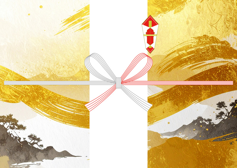 和紙の背景に金箔を貼り付け、波模様をイメージした豪華なのし紙のテンプレートです。縁起の良さ、おめでたさ満開ですね!背景にはうっすらと日本の景色を描き、全体的にバチッといい感じに締まるように仕上げました。お歳暮用として制作していますが、特別なお祝いや新年の挨拶に使ってもいいと思います!