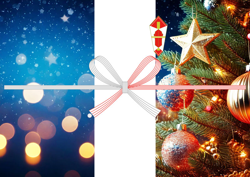 青い夜空とツリーの光が印象的な、クリスマスらしい雰囲気ののし紙テンプレートです。ツリーの飾りやイルミネーションがきらっと映えるように仕上げてみました。クリスマスらしいキラキラしたデザインがいい感じですね。クリスマスプレゼントを包むのはもちろん、イベント用や店舗利用などにもどうぞ!