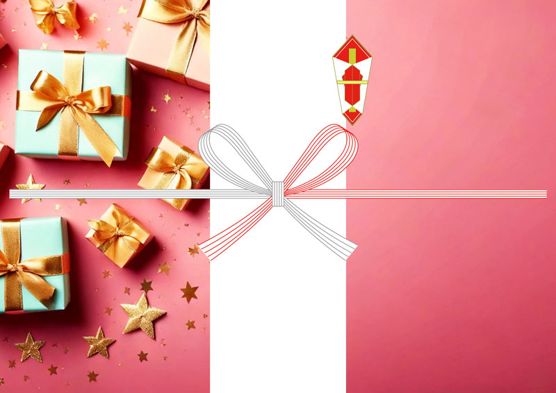 ピンクとゴールドのプレゼントボックスを並べた、明るくおしゃれなクリスマスのし紙テンプレートです。キラッと光るリボンと星のモチーフがいい感じで、クリスマスのわくわく感をそのまま表現してみました。プレゼント包装やクリスマスギフトなど、しっかり豪華に贈りたい場合にどうぞ!