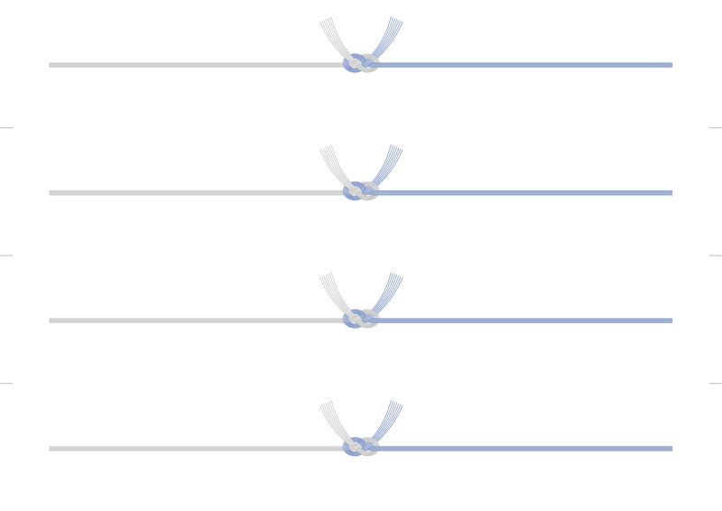 藍銀あわじ結び 7本結び 熨斗なしの巻き熨斗です。主に四十九日や法要、忌明け返礼などで用いられる丁寧な形式です。弔事では熨斗飾りを付けず、掛け紙(水引のみ)として用いるのが一般的です。蓮の絵柄を省いたタイプのため、宗教や宗派を問わず幅広く使えます。A3・A4サイズを用意しており、WordやExcel形式で文字入れや印刷も簡単です。